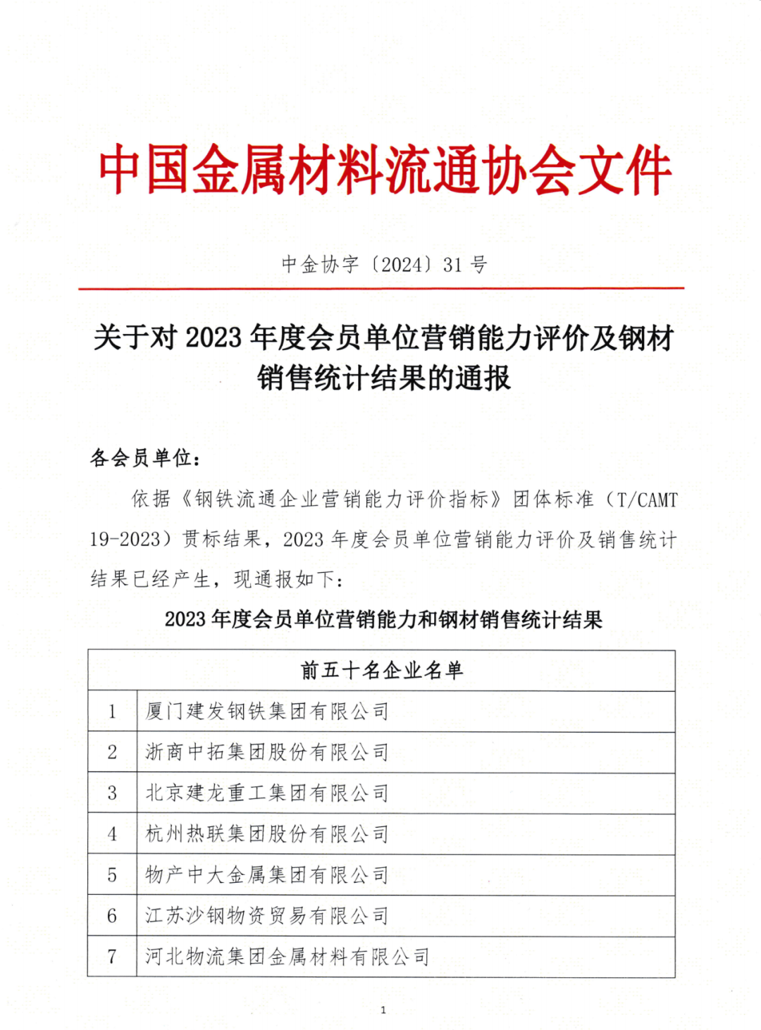 蝉联第一 | 足球竞猜平台 位列中金协2023年营销能力评价及钢材销售统计结果第一位
