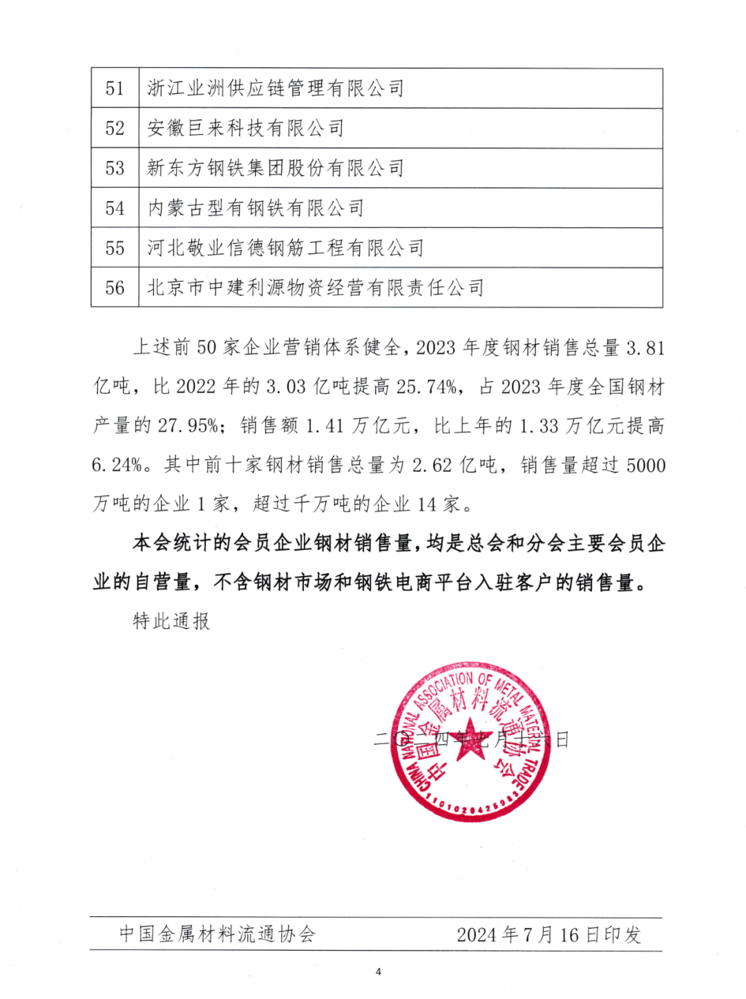 根据中国金属材料流通协会的统计,本次评价结果前50名企业2023年度钢材销售总量 3.81亿吨,占年度全国钢材产量的 27.95%,销售总额1.41万亿元,其中前十家钢材销售总量为2.62亿吨。